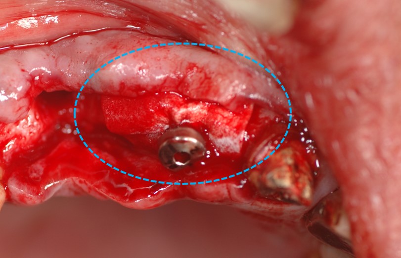 下の写真はGBR法(インプラント埋入と同時)を行っています。吸収性のコラーゲンメンブレン(吸収性のコラーゲン膜)を露出したインプラントの外側に置き、骨造成を行いました。