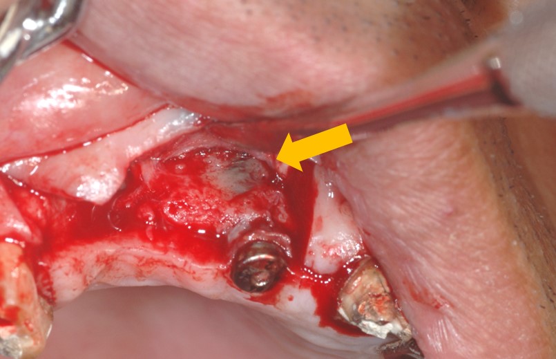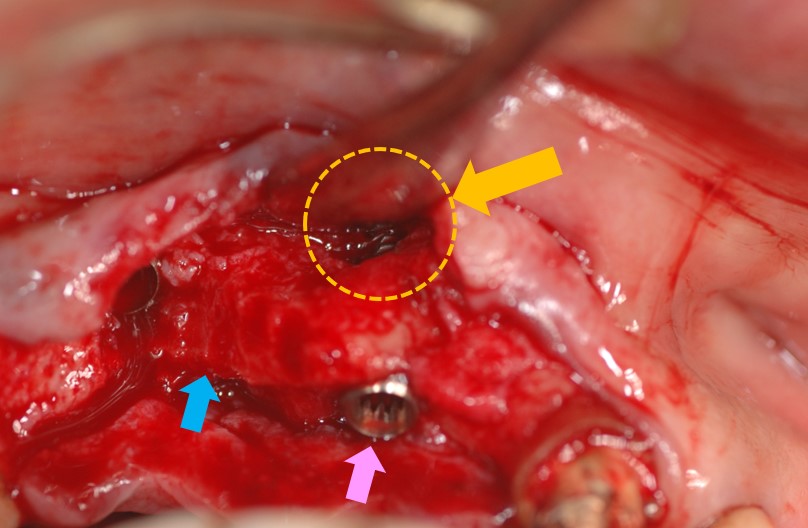 下写真はインプラント埋入手術を行っています。青矢印が「歯槽骨(骨)」で、その幅の中にインプラントを埋入しなければなりません。ピンク矢印がインプラントです。しかしながら、骨幅が足りなかったため、オレンジ矢印部分のインプラントが露出してしまいました。