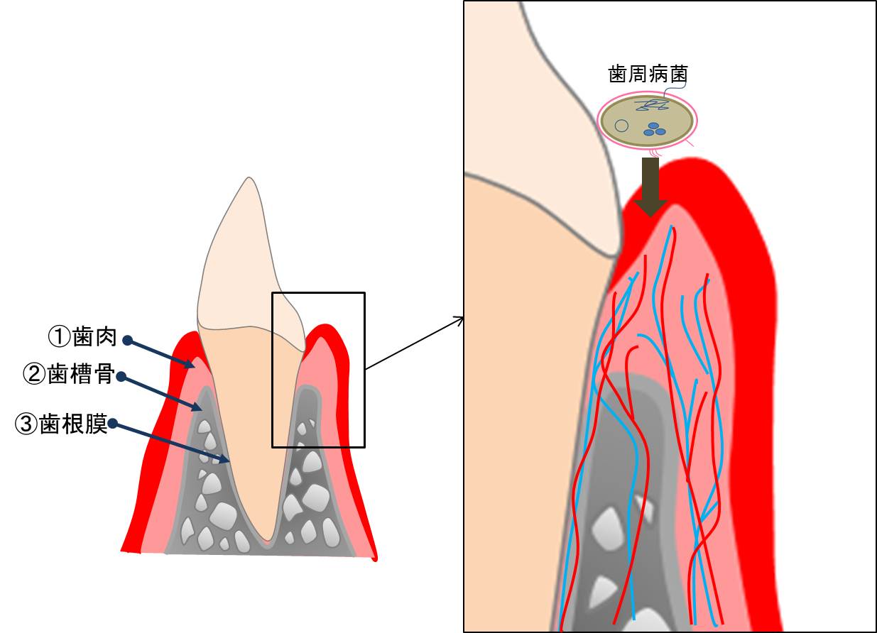歯周組織は、1.歯根膜、2.歯槽骨、3.歯肉の3つの血管系から血液供給されている。この血液供給が細菌感染に対する防御に極めて重要です。(ラタイチャーク カラーアトラス歯周病学より改変引用)