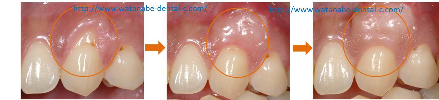 術前~基本治療終了後~術後を示します。 オレンジラインで囲んだ部分が骨吸収を起こした部分になります。オレンジで囲んだ部分が小さくなっています。