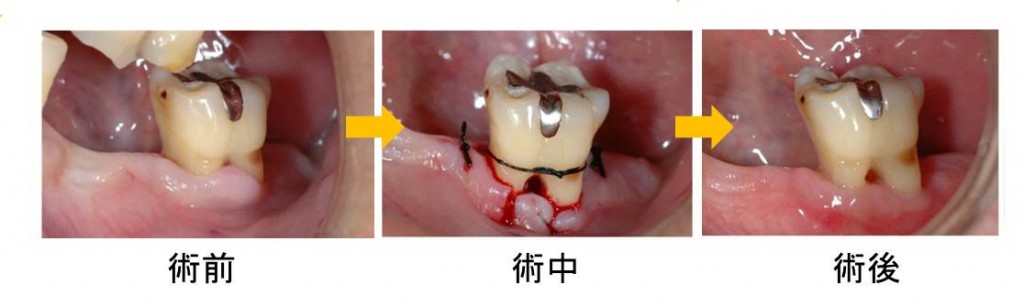 写真の歯は根と根の間に歯周病が進行してしまい、さらにその部分に歯茎が被っていて磨けません。そこで、歯茎を下に少しずらして歯間ブラシが通るように調整しています。これを、トンネリングといいます。