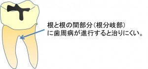 しかし、根が2本あるということは、根と根の間(根分岐部といいます)に歯周病が進行した場合はとても治りにくいという特徴があります。