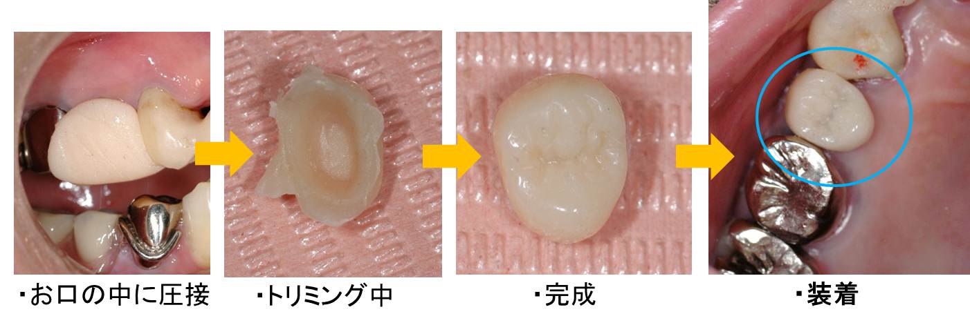 左下写真は前々回のブログでご紹介した歯の土台(金属)が入っている状態です。歯科樹脂の粉と液を混和して塊にして、お口の中に圧接します。