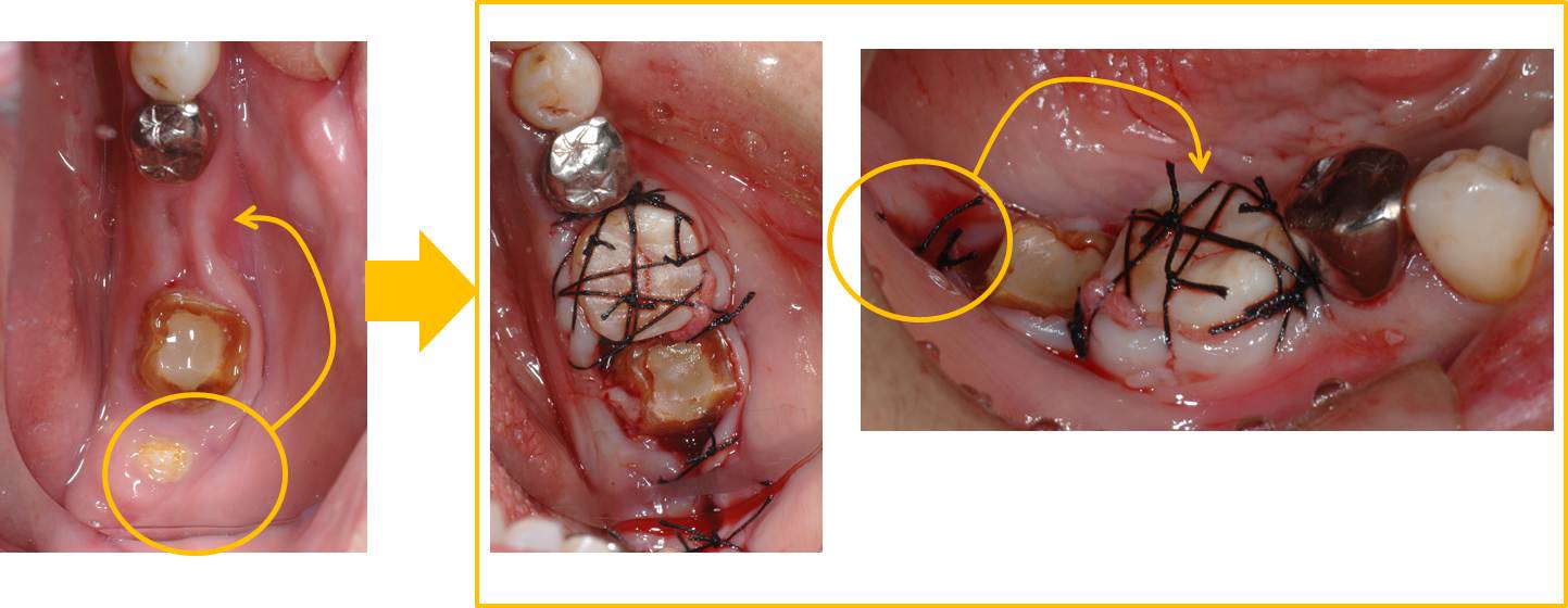 歯の周囲にある歯根膜という組織(30μmくらいのフィルム)があり、その組織が移植の成功の鍵を握っています。その組織に骨、セメント質などを再生してくれる細胞があります。つまり親知らずを抜くときにできるだけ歯根膜は損傷してはいけません。今回は、上手くSRPで対応し歯周ポケットが改善しました。