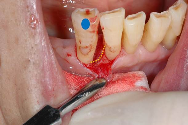 歯肉を剥離して、掃除が終了した状態です。(オレンジの点線部分が失われた歯槽骨)