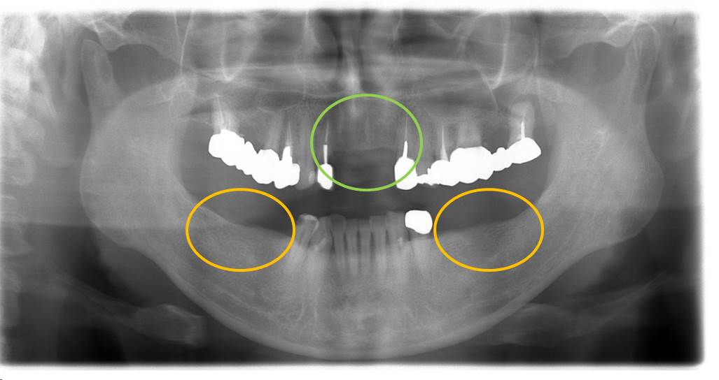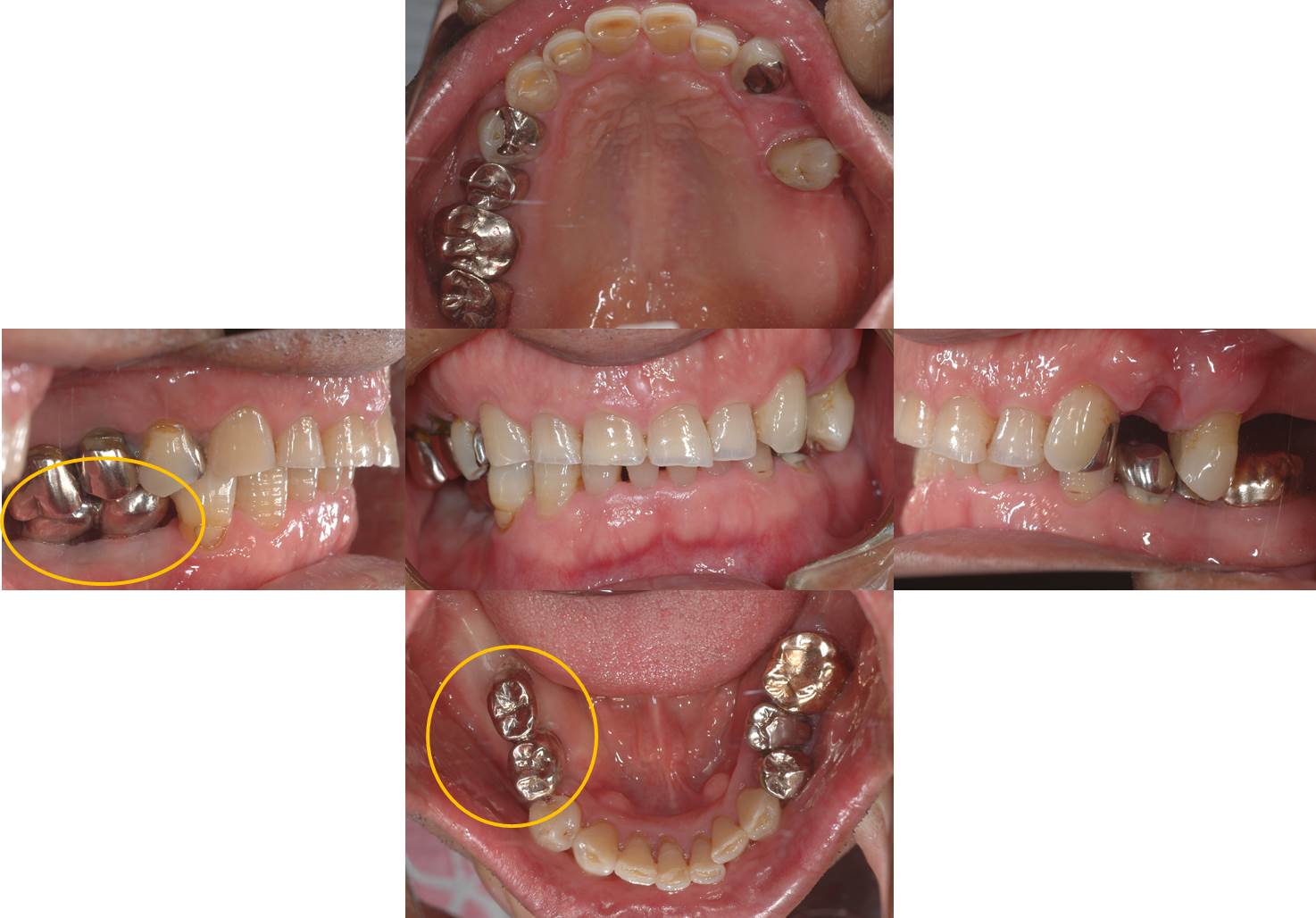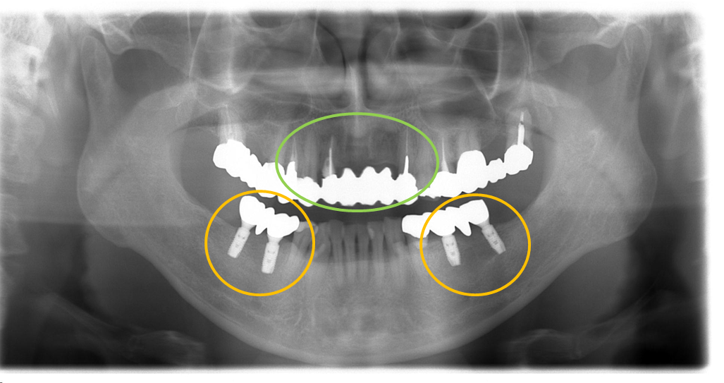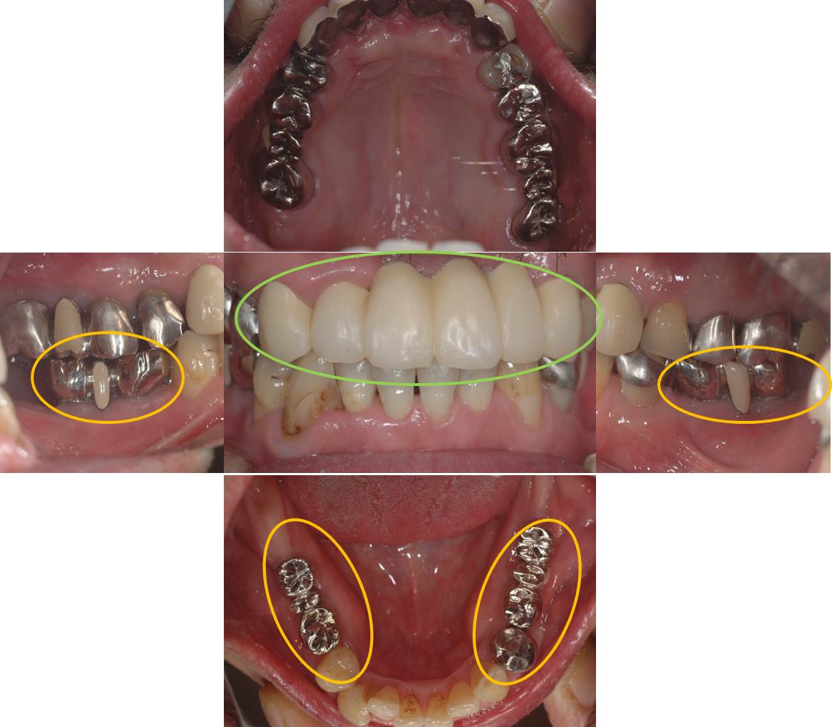 緑○部分は歯を切削してブリッジを予定し、オレンジ○部分はインプラントとする計画としました。