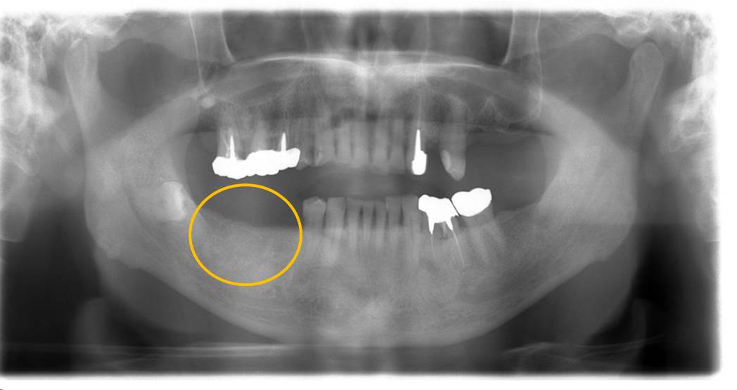 右下の欠損部に取り外しの入れ歯が装着されていました。しかし、入れ歯ではない方法で右だけでもしっかり噛みたいということで、インプラント治療を希望されました。歯周病治療が完了し、インプラント治療に移行しました。