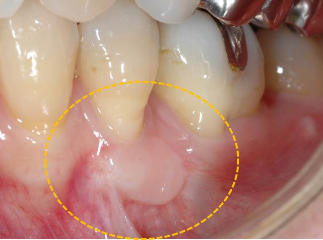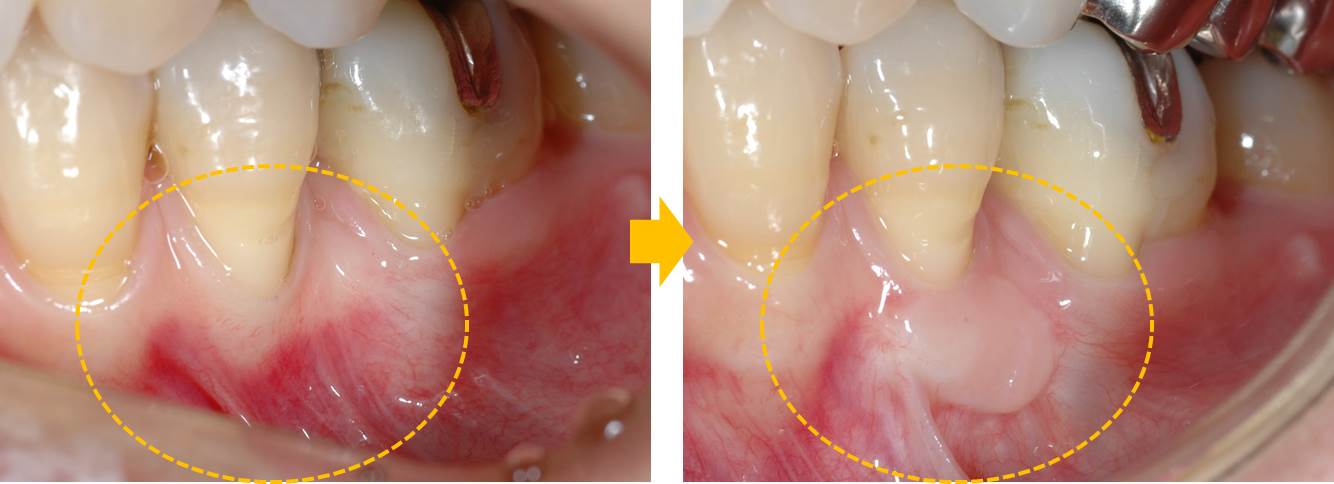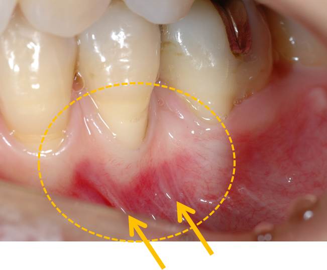 歯科矯正後に「歯がしみる」という主訴で来院されました。いわゆる知覚過敏で虫歯ではありません。歯肉が薄く、動かない歯肉が少ないために歯肉が痩せてしまっています。さらに矢印の部分の小帯が歯肉を引っ張っています。