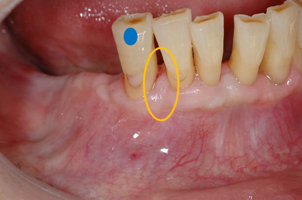 この部分の歯を削って詰めても、歯肉が薄いために知覚過敏がおこっているので、解決しません。歯に詰めるのではなく、歯肉を作れば良いのです。