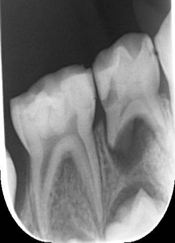 根管治療を行い、半年後のレントゲン写真です。根尖部のエックス線透過像が改善されました。