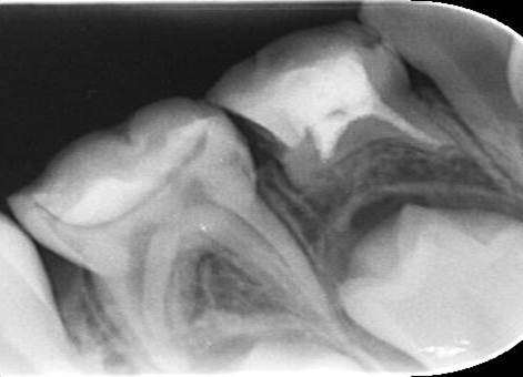 レントゲンを見ると○部分にエックス線透過像が観察されていますので、根尖部に膿瘍があることが分ります。