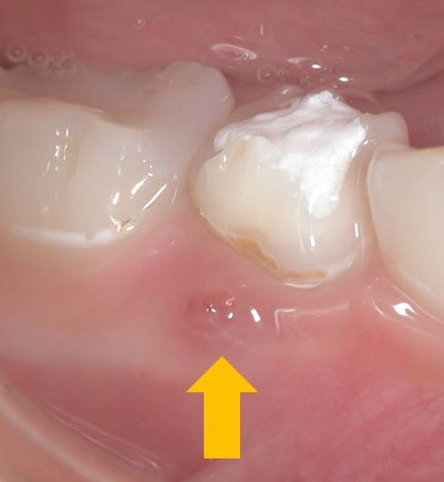 矢印部分に歯肉から膿瘍形成が観察されます。