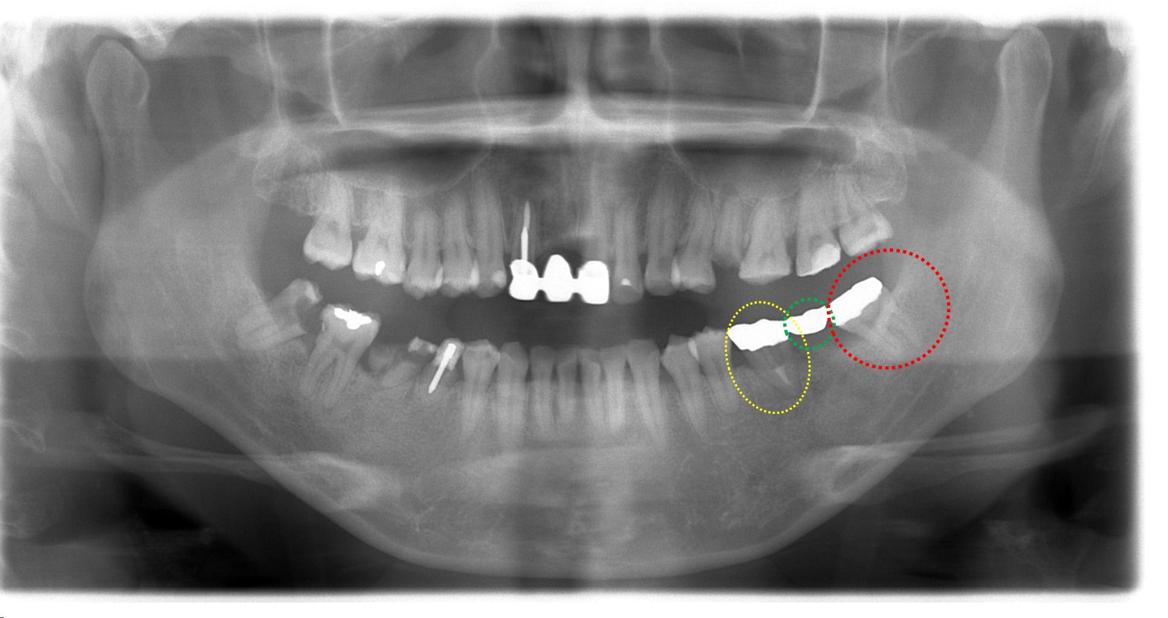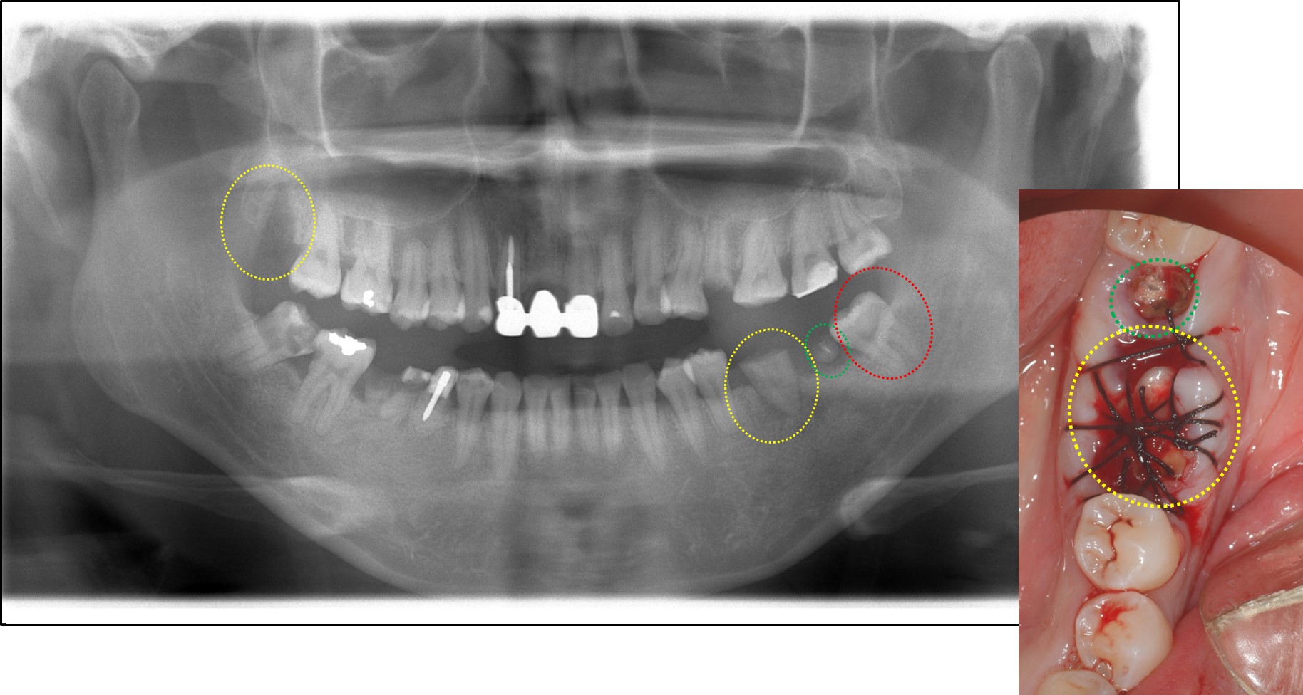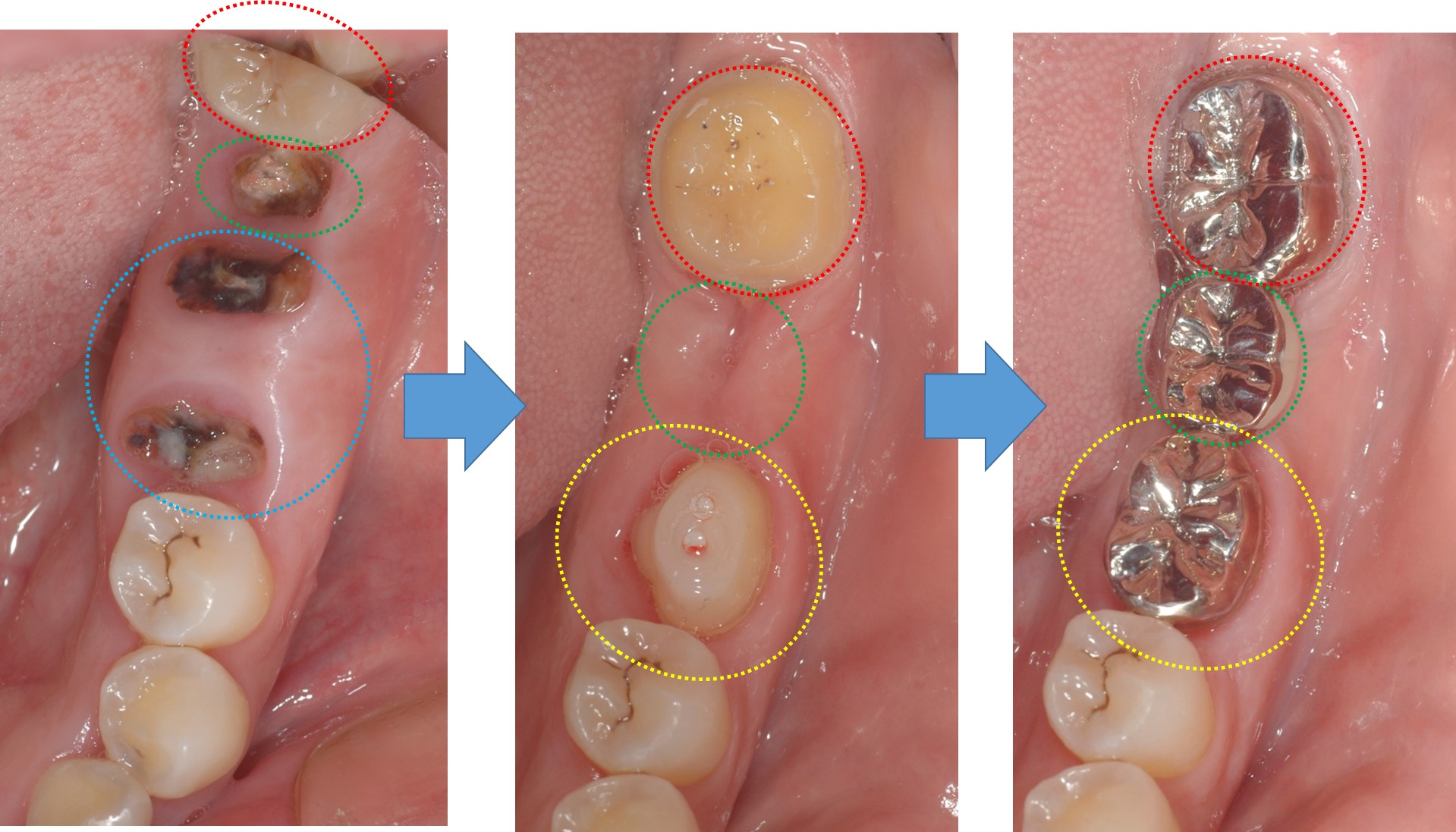 青〇と緑〇の歯は根だけの状態になっており抜歯する必要があります。