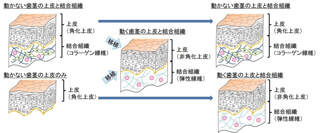 ①の場合は、移植されたことで動く歯茎は動かない歯茎に変化しますが、②の場合は、動く歯茎は動く歯茎のままになり変化は見られません。このことで上皮が角化するか、角化しないかは、「上皮下の結合組織」が決めていることになるのです。