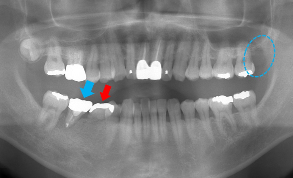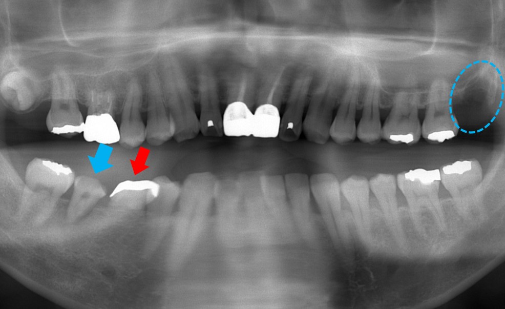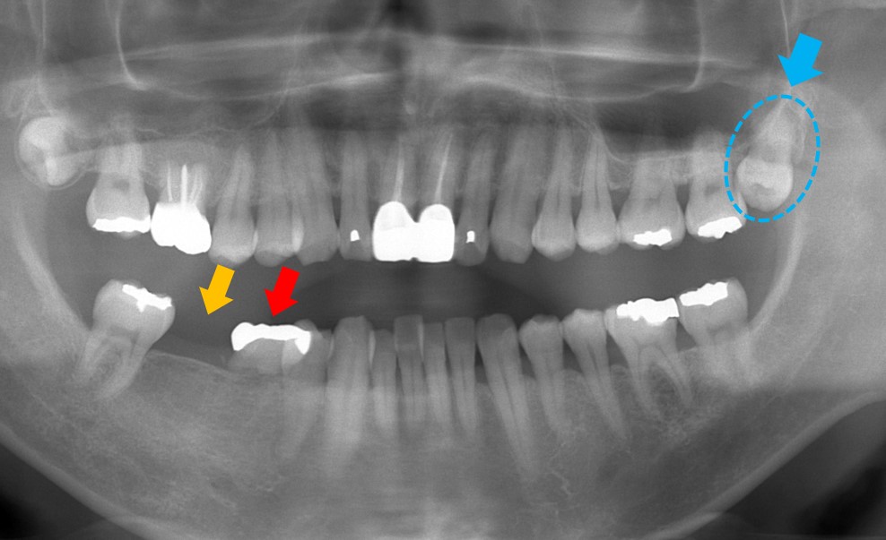 オレンジ矢印の部分が欠損しています。赤矢印は乳歯ですが、動揺もせず何十年もこのままの状態であることから、乳歯はそのまま処置せずに欠損している部分(オレンジ矢印部分)に青矢印の親知らずを移植する計画としました。