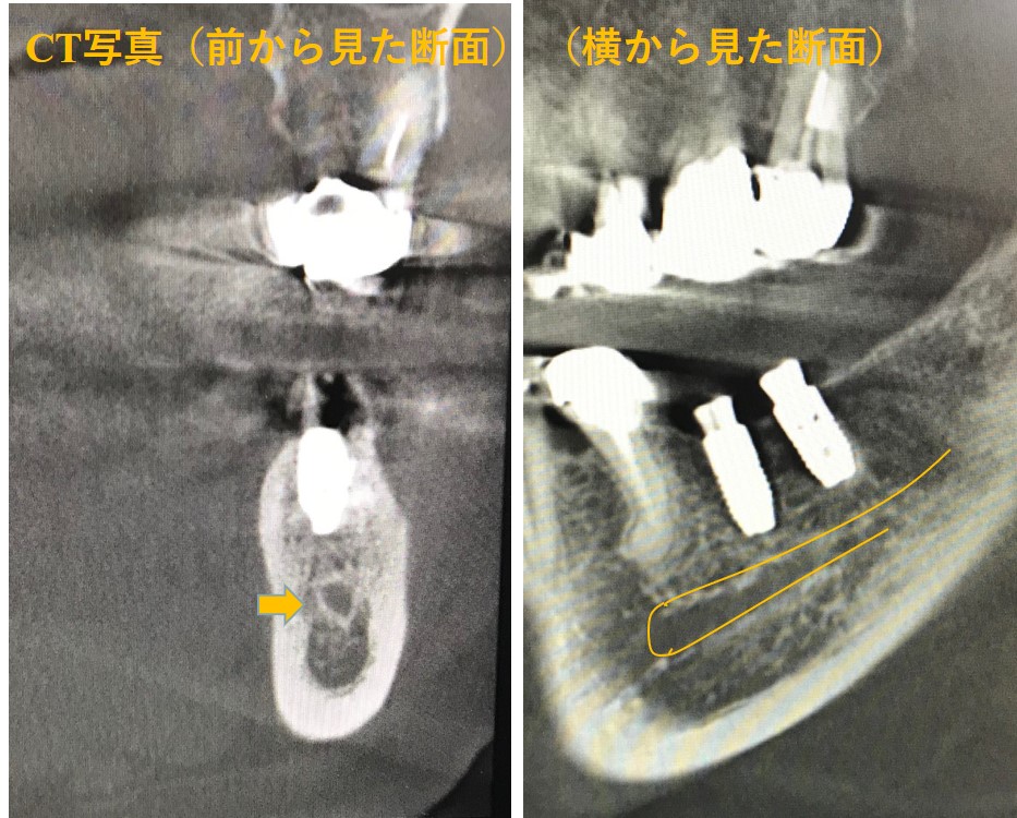 左写真が前からの断層写真です。インプラント(真っ白に写っている部分)と下顎管(オレンジ矢印)には安全な距離が保たれています。右写真は横からの断層写真です。オレンジ線が下顎管です。インプラントと下顎管には距離があるため、問題なく2本のインプラントが埋入できました。