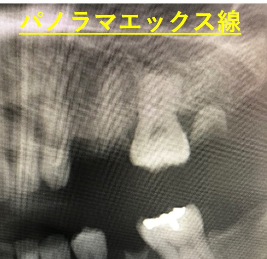 パノラマエックス線写真では、上の真ん中に膿の袋が見えます。しかしながら、2本の歯根が重なっていてどちらの膿かわかりません。