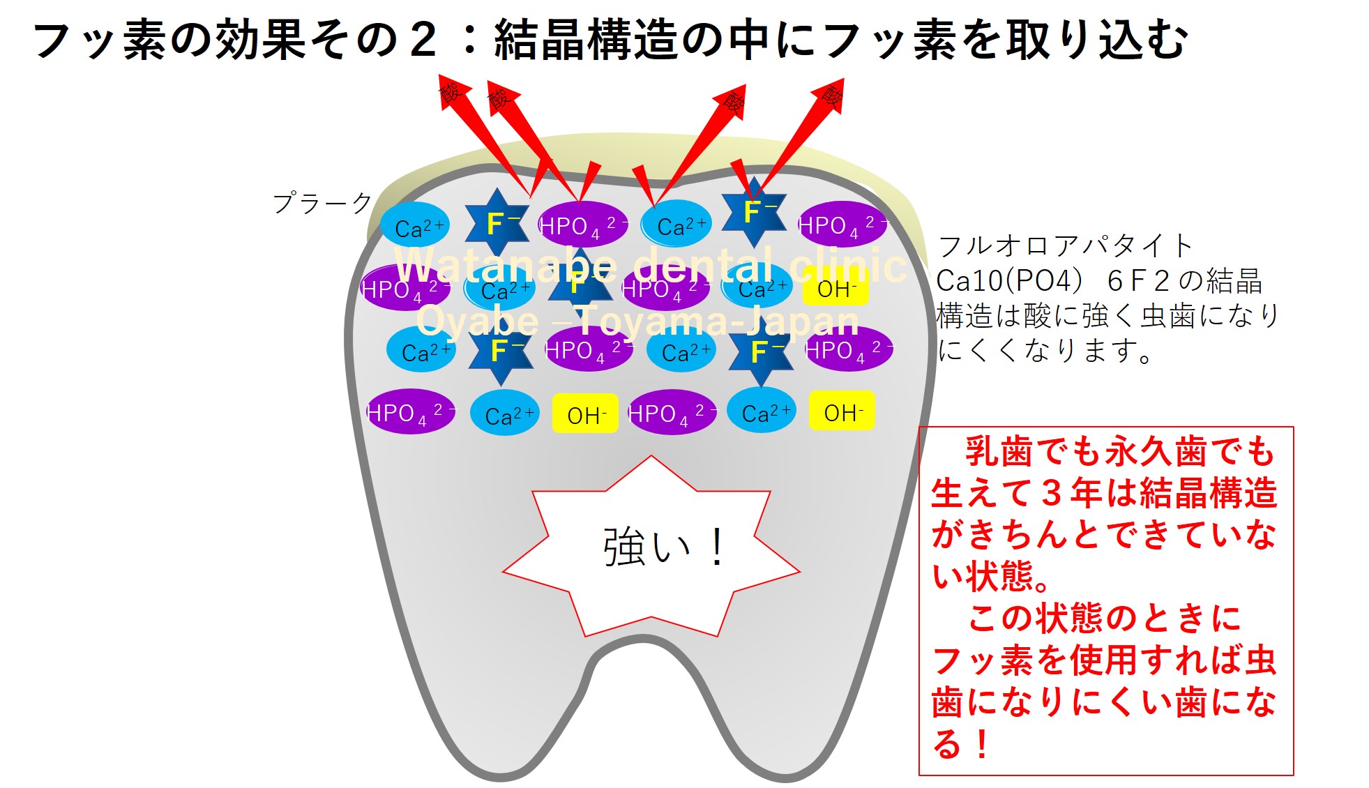 ですから、歯の生えたての「幼弱」な状態のときにフッ素を使うとより効果的ということです。