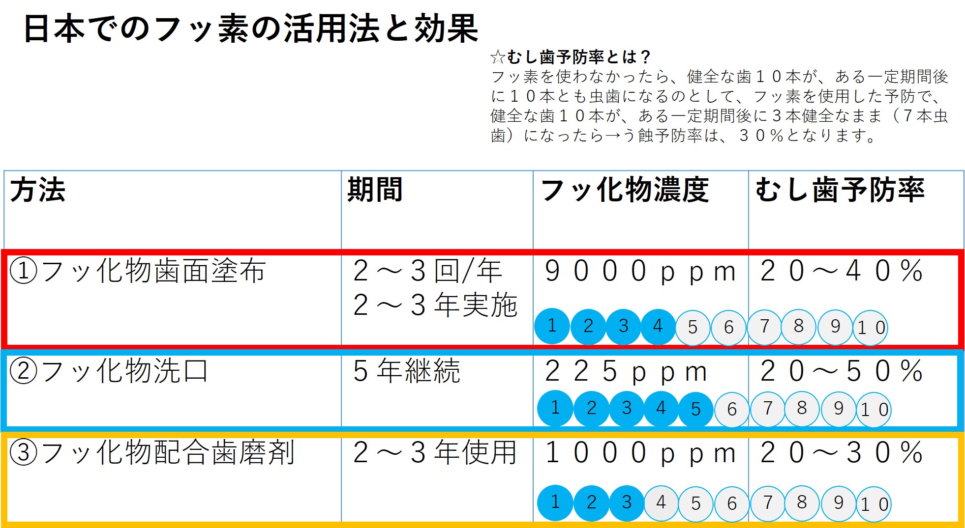 ①は10本歯があれば最大4本、②は5本、③は3本の歯を虫歯にさせない効果があるということです。それを「う蝕予防率(むし歯予防率)」といいます。