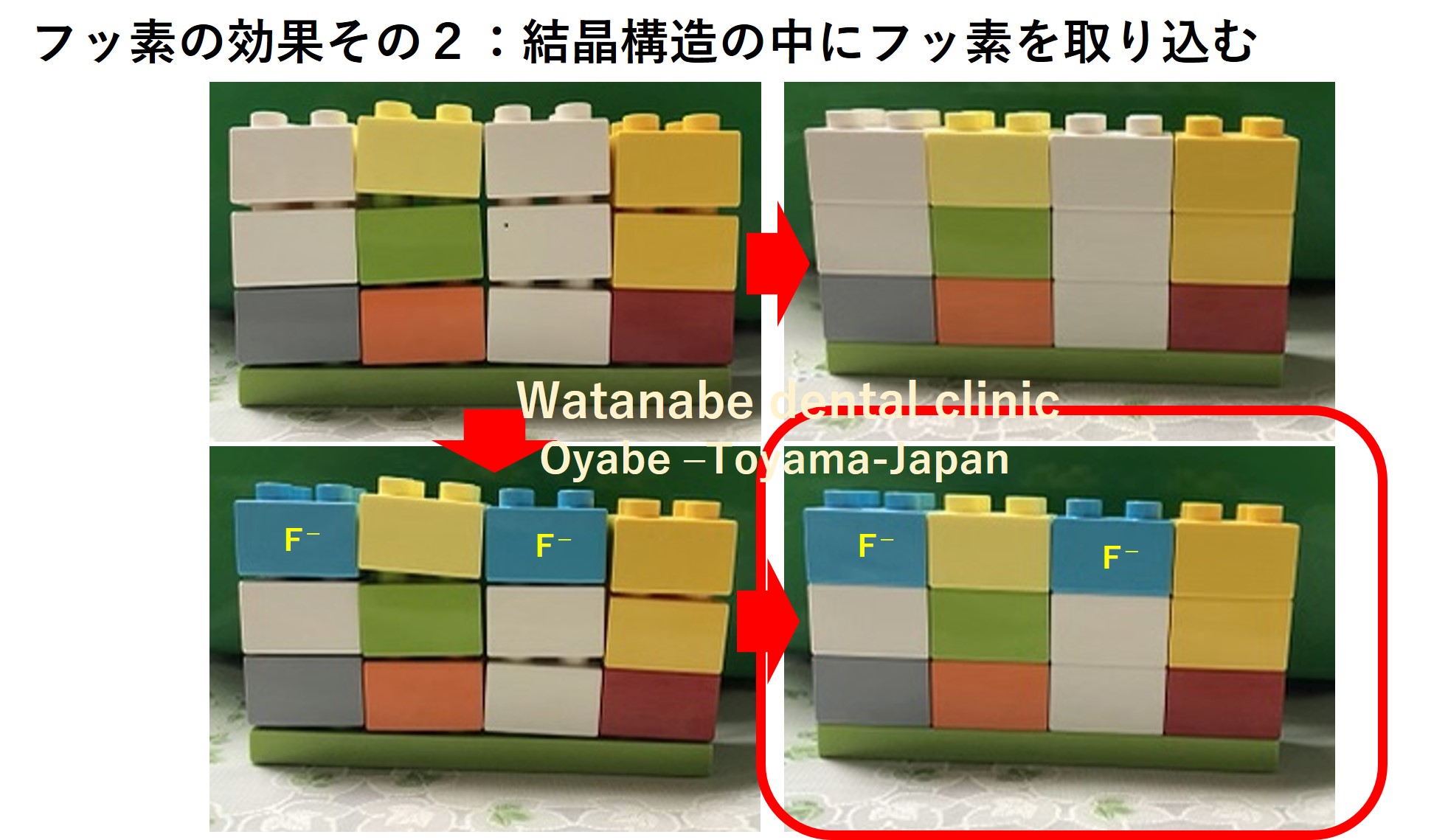 結晶構造が完成していない状態にフッ素を使って歯を強化するとLEGOの下段のような過程をたどり、歯の結晶構造の中にフッ素が取り込まれ酸に強い歯になる訳です。