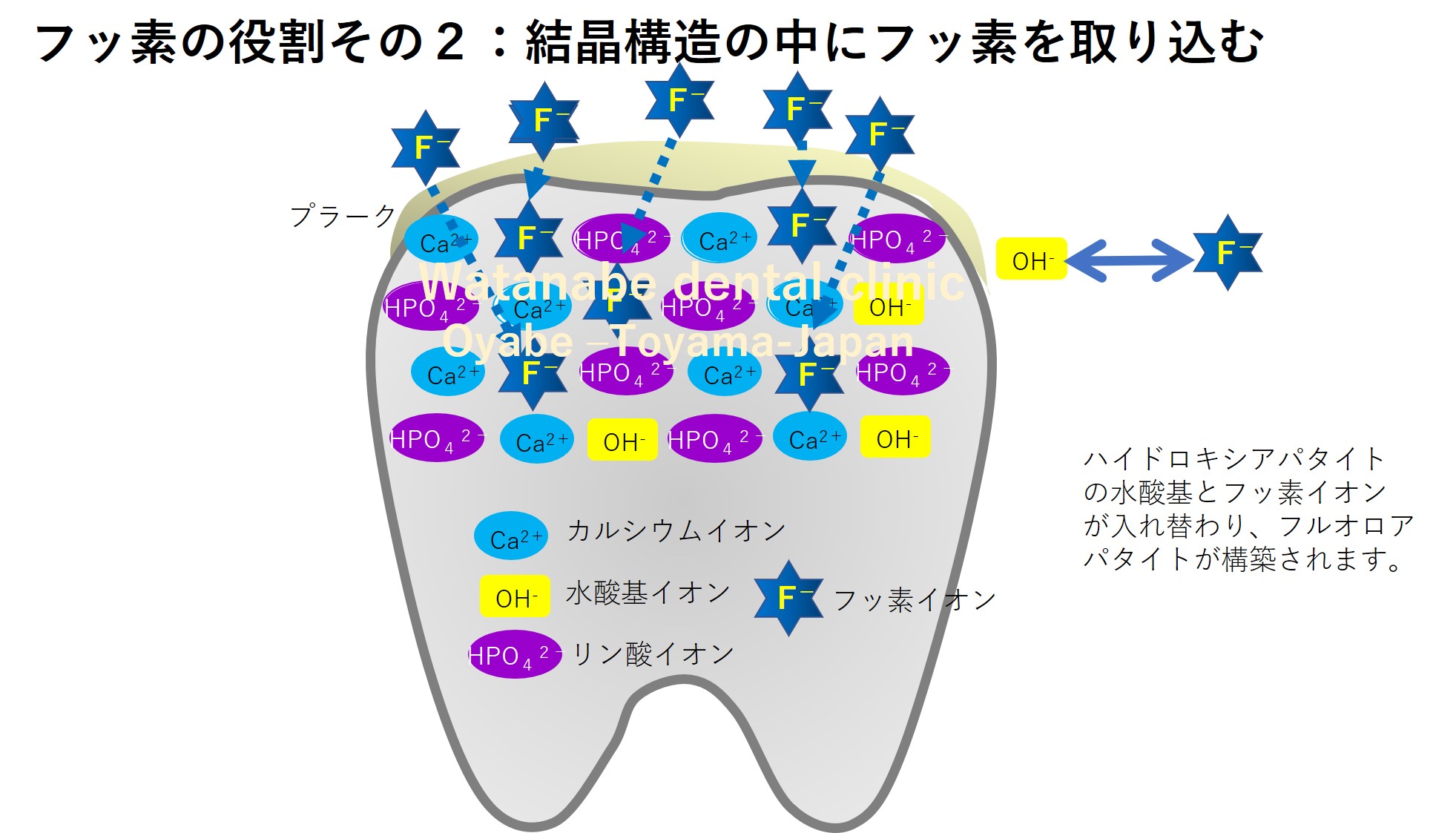 また、歯の結晶構造の中にフッ素が入り込むことで、本来の歯の完成体である「ハイドロキシアパタイト」という構造より強い「フルオロアパタイト」という構造になります。