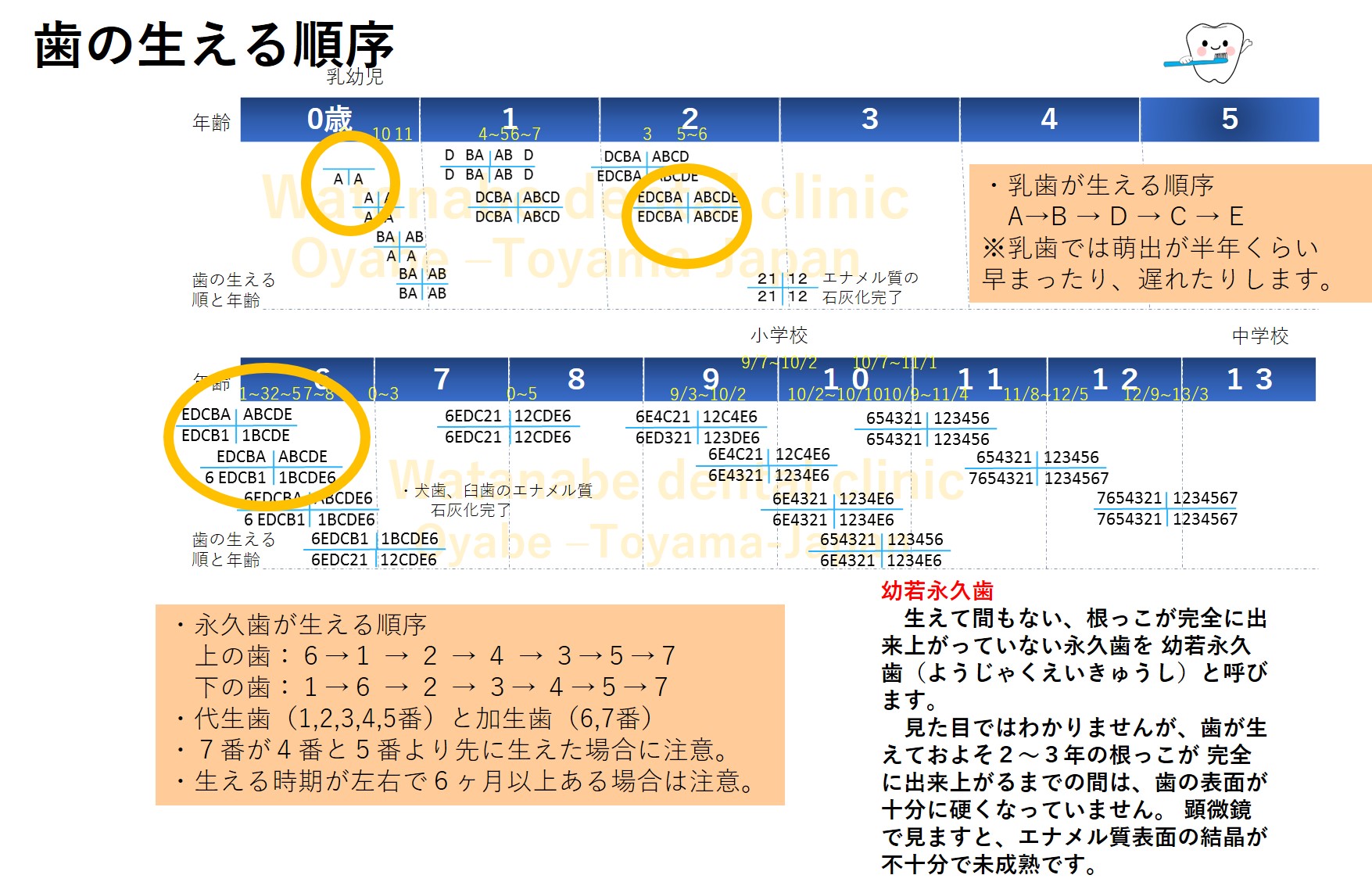 歯の生えてくる年表。生後6か月、2歳半、6歳がポイントになります。