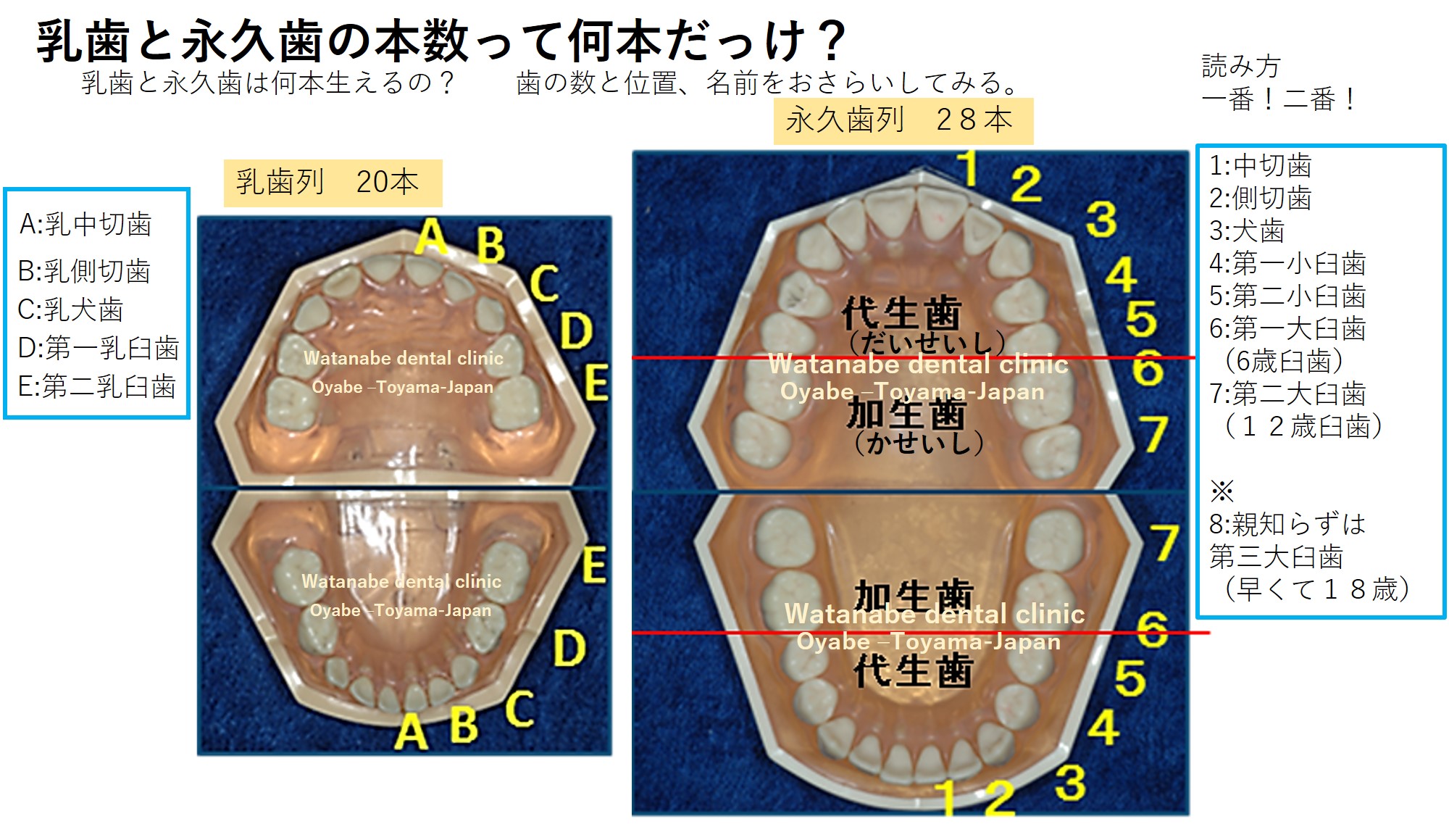 乳歯と永久歯の違いについて。A~Eは永久歯へと生えかわるので代生歯、奥歯の6・7番は生えかわりではないので加生歯といいます。
