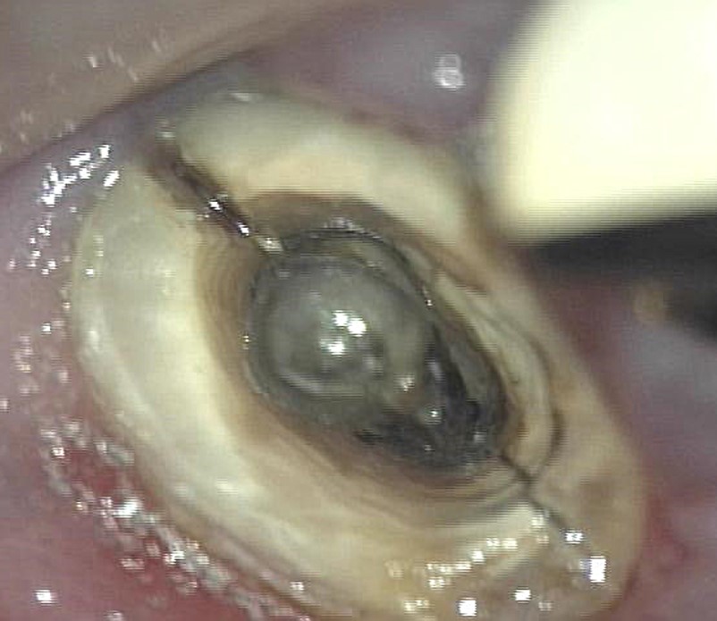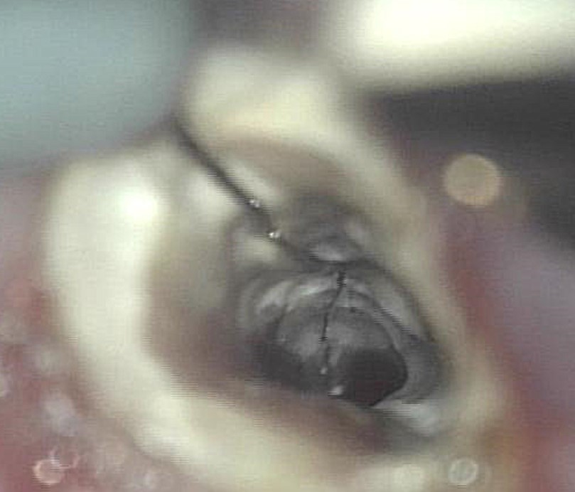 根管治療(根の中の消毒)を行っていましたが、根管内からの排膿(膿がでること)が止まりません。そこで、根管を大きく拡大(根の管を拡げる)して開窓(根の先の膿が出るように空気に触れさせること)させるようにしました。