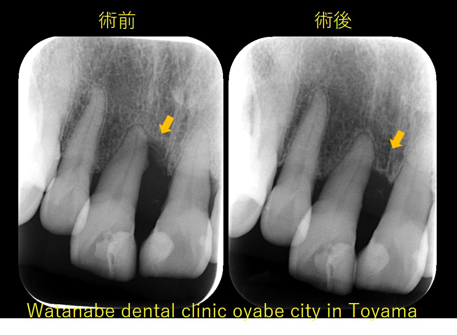 右写真が術後です。術後の矢印部分の歯槽骨が再生しているのが確認できます。歯周ポケットも改善しました。