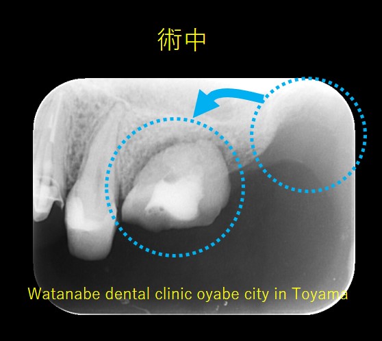 術後3~6ヶ月かけて骨再生が起きるため、術直後では骨の再生は確認できませんでしたが、術後5年(右)では、オレンジ矢印部分の黒い影がなくなり骨が再生されていることが確認できます。
