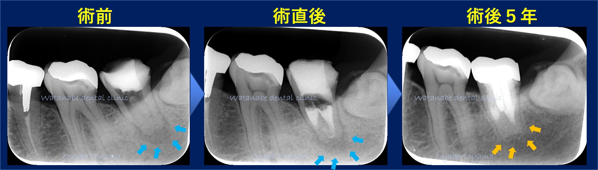 しかしながら、根管治療とSRP(スケーリングルートプレーニング)のみで術後写真(右)まで回復しました。顕著に骨再生が認められます。歯の動揺も改善しました。
