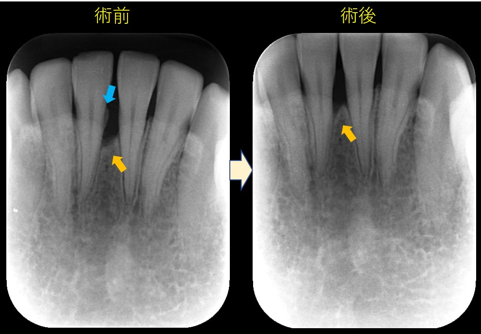 術前の写真では、青矢印部分に大きな骨吸収が確認できます。歯の動揺もありました。術後の写真では、青矢印部分に歯槽骨の再生が確認できます。