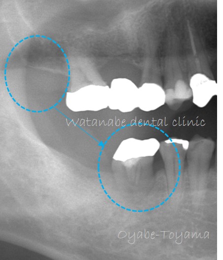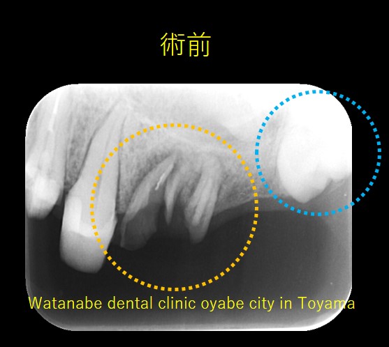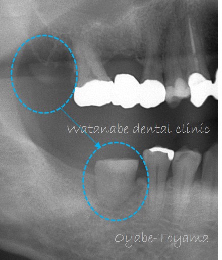 このまま親知らずを抜歯してしまうのが勿体ないので、この親知らず(青○)をオレンジ○部分へ移植する計画としました。