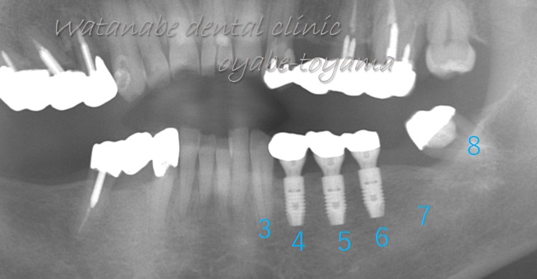 4,5,6,7と4本の歯が喪失していますので3と8を支台としたブリッジも歯の移植も不可能な状態です。そこで、インプラントを選択しました。