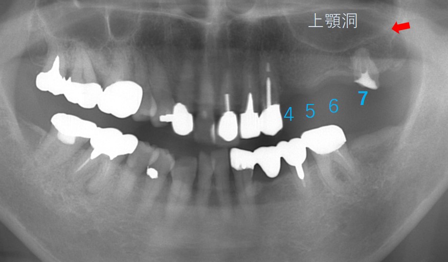 インプラントは、4番と6番に計2本埋入予定。4番は9mmの長さ、6番は上顎洞があるためショートインプラント(6mm)を予定しました。