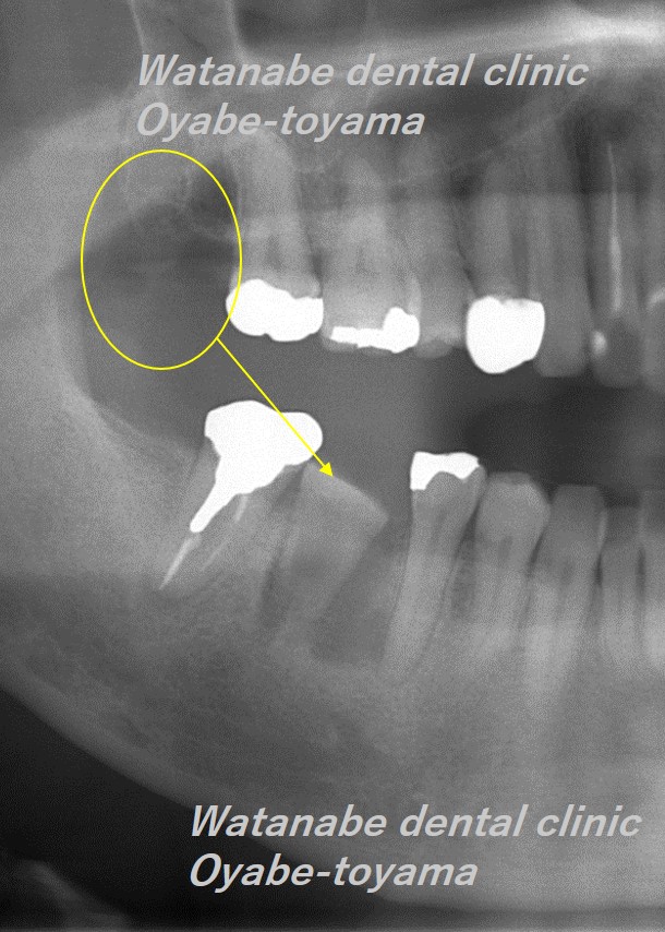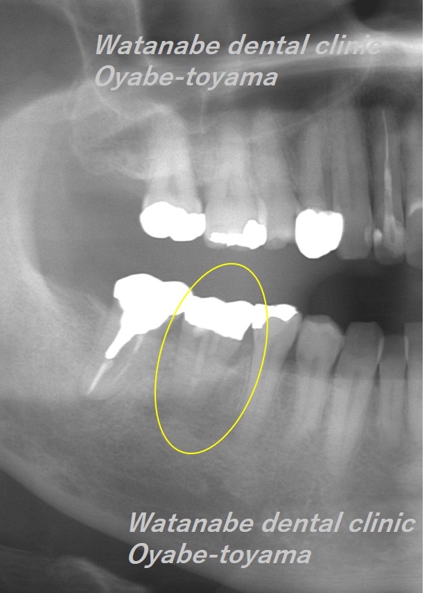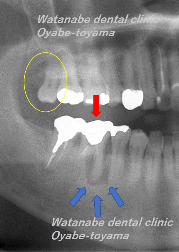 赤矢印の歯は歯根破折(根が割れている)しているため抜歯するしかありません。青矢印部分に細菌感染による大きな骨吸収が確認できます。