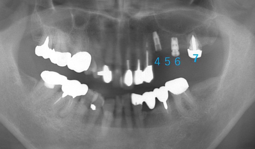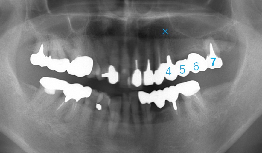 70歳女性です。4番が歯根破折(歯の根が折れる)ため抜歯適応となりました。4、5、6と3本の歯がなくなってしまうためブリッジはできません。また、入れ歯にも抵抗があるためインプラント治療を計画することとしました。