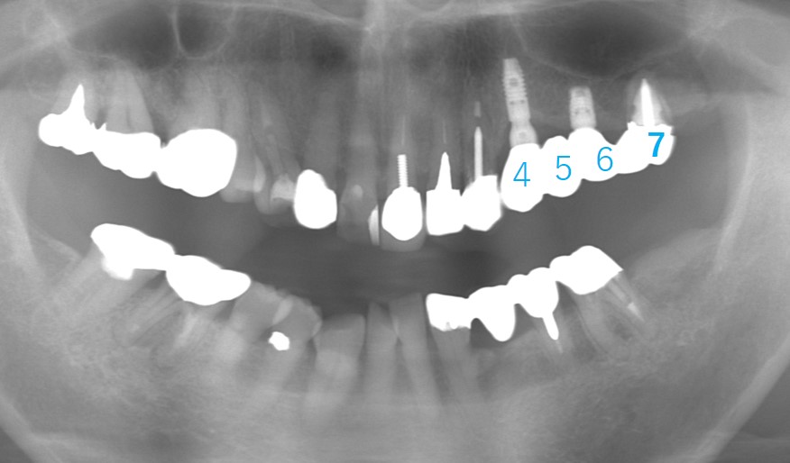 7番は内冠(被せものを2重にして取り外せる)を装着して、インプラントと連結したブリッジになっています。
