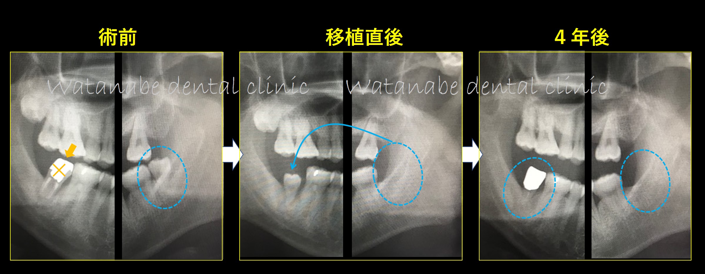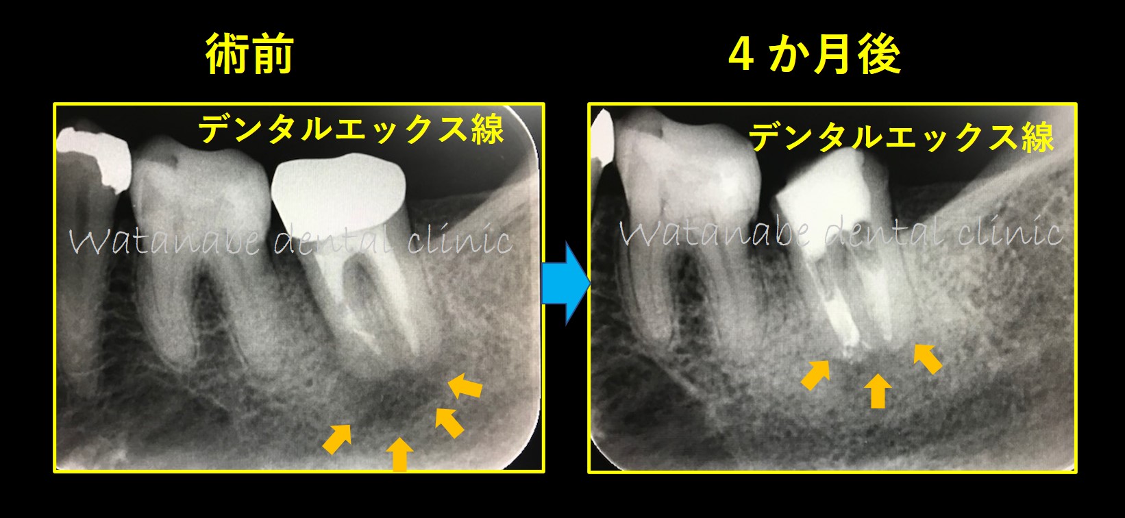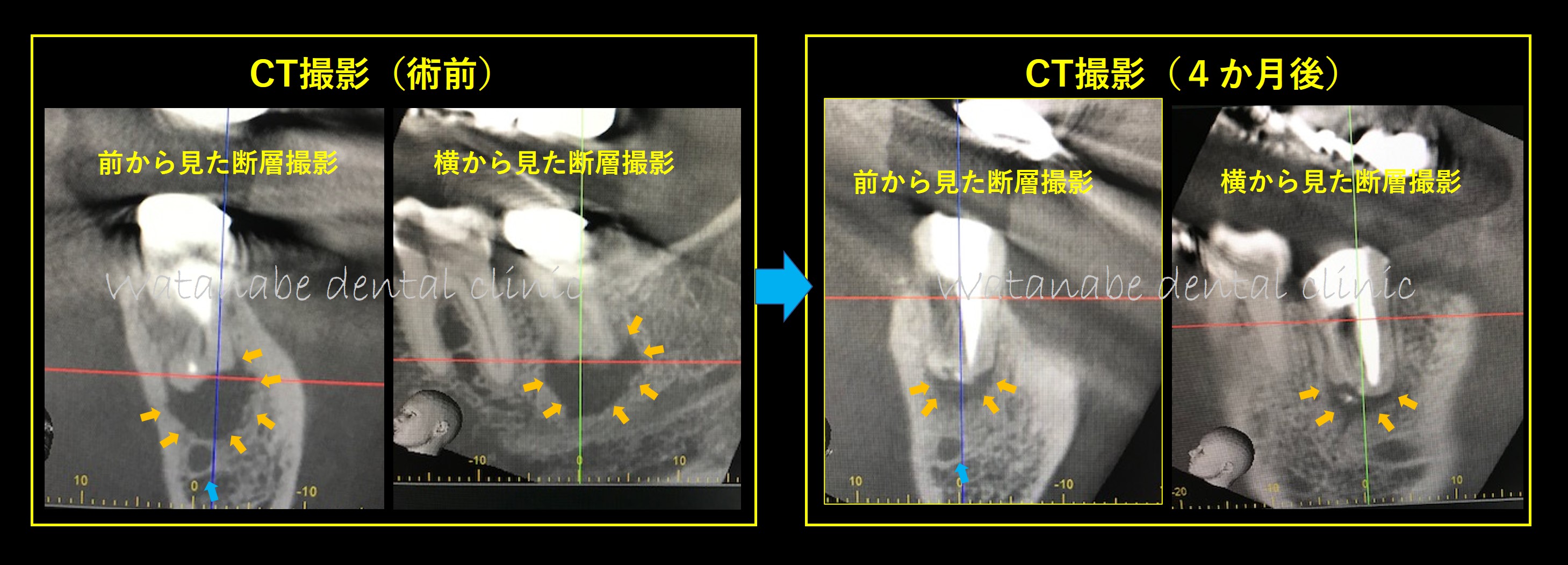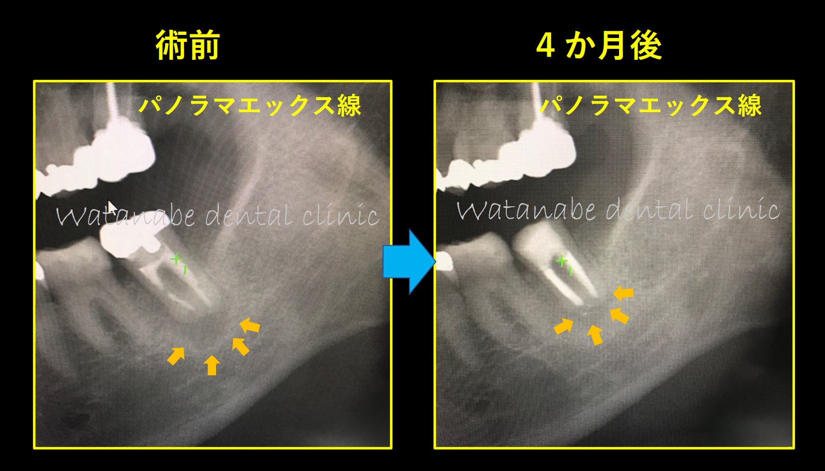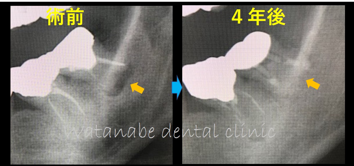 4か月後と4年後の比較です。オレンジ矢印部分の骨が綺麗に再生しているのが確認できます。