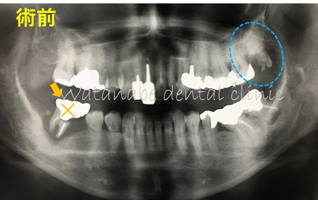 オレンジの×印の歯は根の先まで骨吸収があり抜歯するしか方法はありません。そこで、青〇の親知らずが放置され余っています。