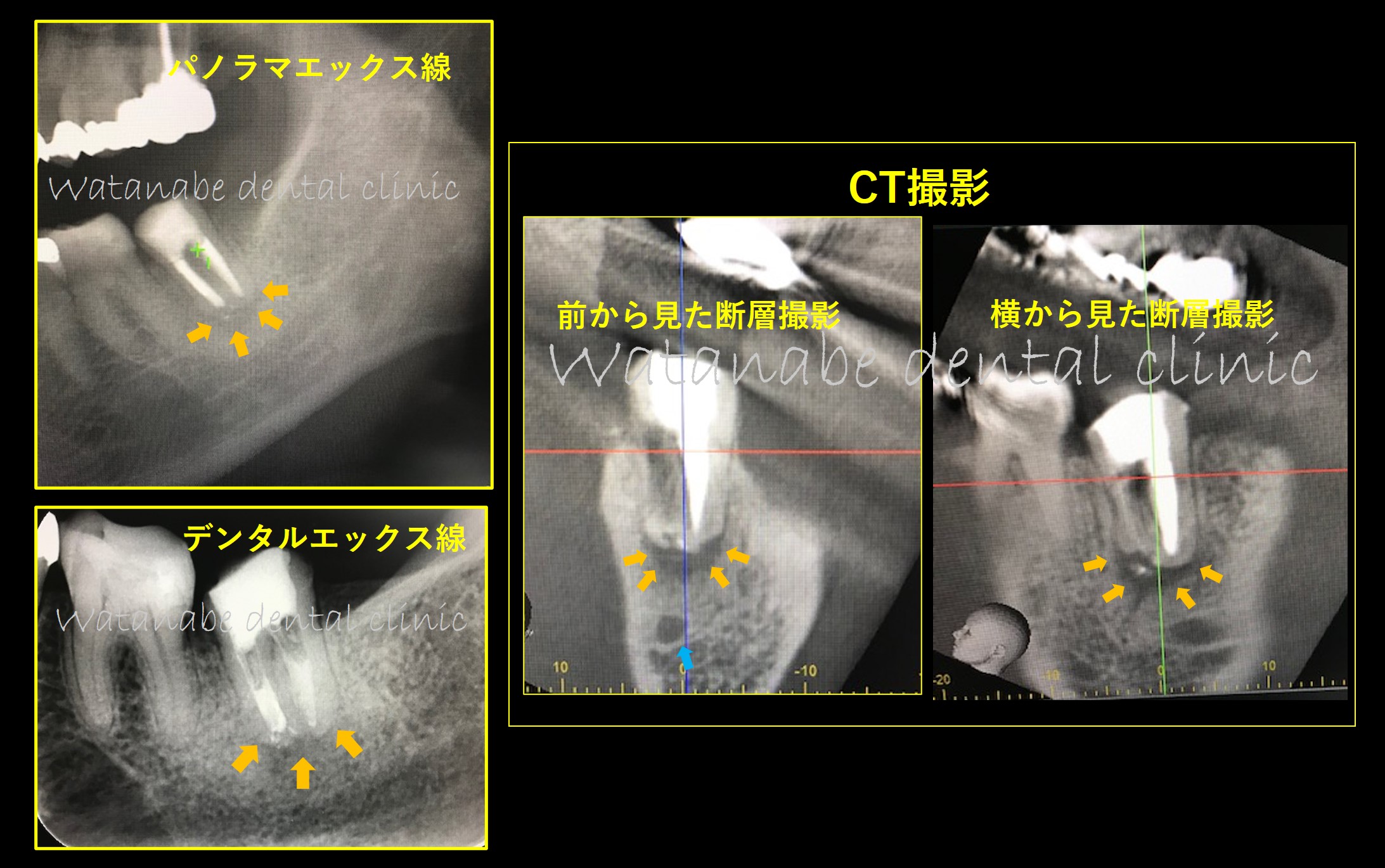 パノラマ、デンタルの写真でわかるように大きな病巣です。また、CT撮影も行いました。CT写真の「前から見た断層撮影」では、オレンジ矢印が病巣で、青矢印が下顎管といって神経線維や血管の束が走行している空間です。この下顎管まで病巣が大きくなれば、唇の痺れなど大きな問題が起きることが予想されるため、慎重に根管治療を行う必要がありました。