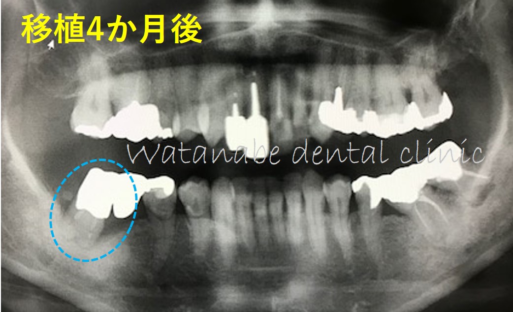 移植後、4ヶ月のエックス線写真です。移植した歯は1ヶ月後より根管治療→支台築造(歯の土台)→ブリッジへと治療を進めました。