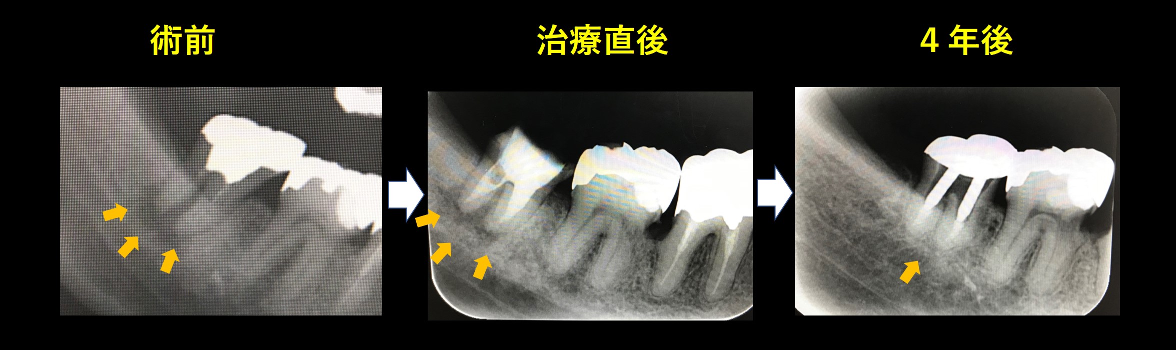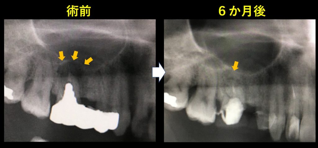 左が術前、歯茎の腫れおよび動揺が確認されました。矢印部分に黒い影が見られます。根の先の骨が感染で溶けています。