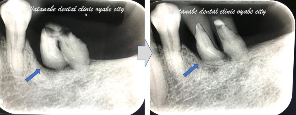 この後、①と③の歯根が残ったこの青〇の歯を下へと移植しました。移植直後が下写真です。