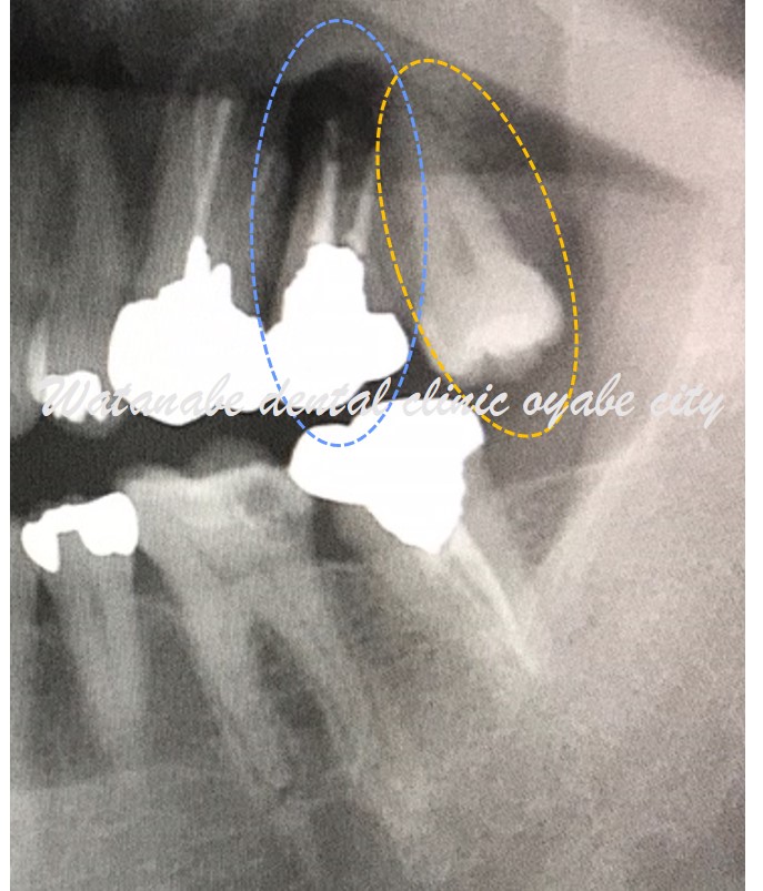 下写真の青〇の歯は歯根が折れていて抜歯となります。その隣にオレンジ〇の親知らずがあるため、青〇の歯を抜歯してオレンジ〇の親知らずを移植する計画としました。