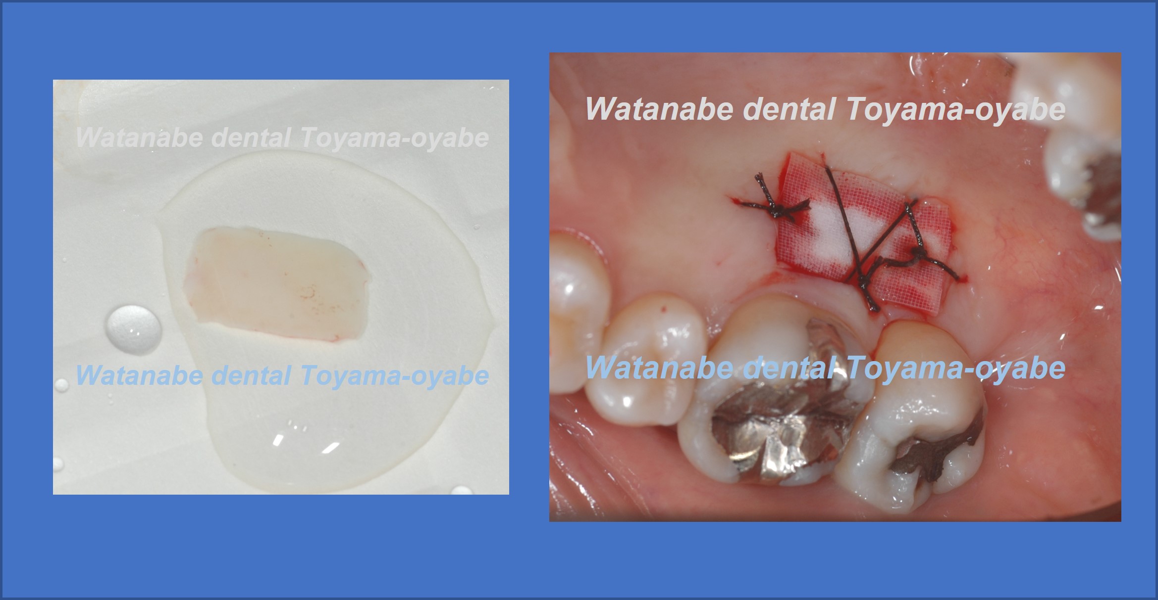 歯茎を移植した部位にはテルダーミスというコラーゲンを移植して縫合します。この部位は2~3週間程度で元の状態に戻ります。